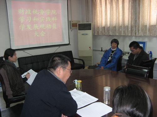 姚东旭书记首先阐述了深入学习实践科学发展观活动的重要意义,接着向参会教师细致解读党委书记柯文进在学校深入学习实践科学发展观活动动员大会上的动员报告。姚东旭书记针对学校学习实践活动的工作部署和要求,提出了学院党总支和全体党员要深刻领会报告内容,紧紧围绕“突出办学特色,加强内涵建设,推动教育创新,促进科学发展”的这一主题,扎扎实实开展好学习实践活动,深入学习,认真实践,做好学院活动的实施方案,确保活动有实效,开辟学院发展的新天地,为使我校成为一所高水平的财经类大学贡献力量!随后,姚东旭书记宣布了搜书吧 党总支深入学习实践科学发展观活动中心小组的构成。小组成员也在会上作了积极的发言。