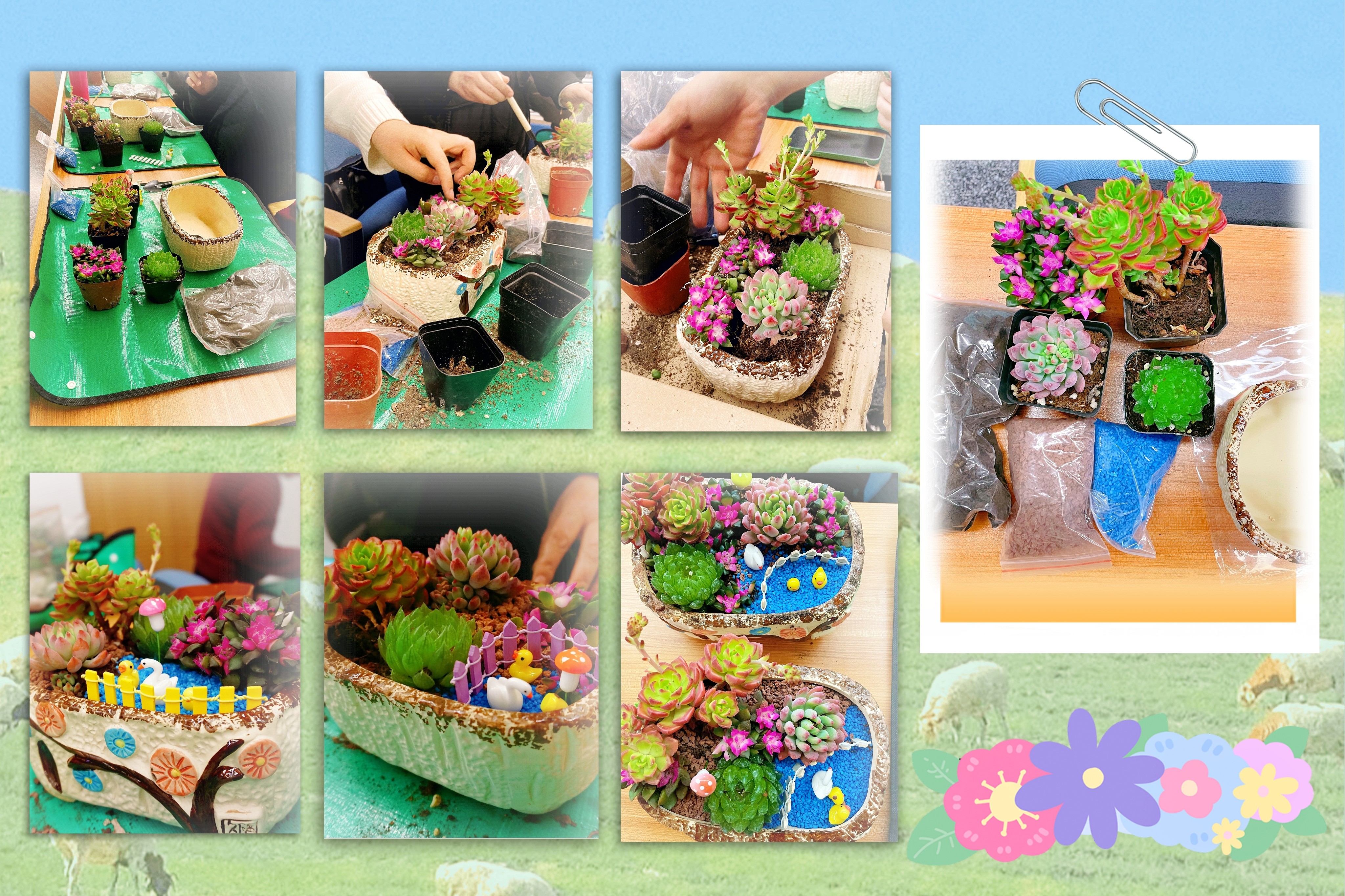 当前,正值春季,温度适宜,这无疑是多肉植物的生长旺季,也是其繁殖的最佳时节。教职工们纷纷动手制作,小翼翼地取出一株株精美多肉植物,用小铲子将营养土填充至微景观花盆中,精心调整多肉植物的位置,再按照自己的喜好用彩石、小鸭子、天鹅、栅栏等装饰品点缀盆景,全程不亦乐乎。短短的时间内,一盆盆错落有致的“多肉微景观”艺术品展现在大家面前。