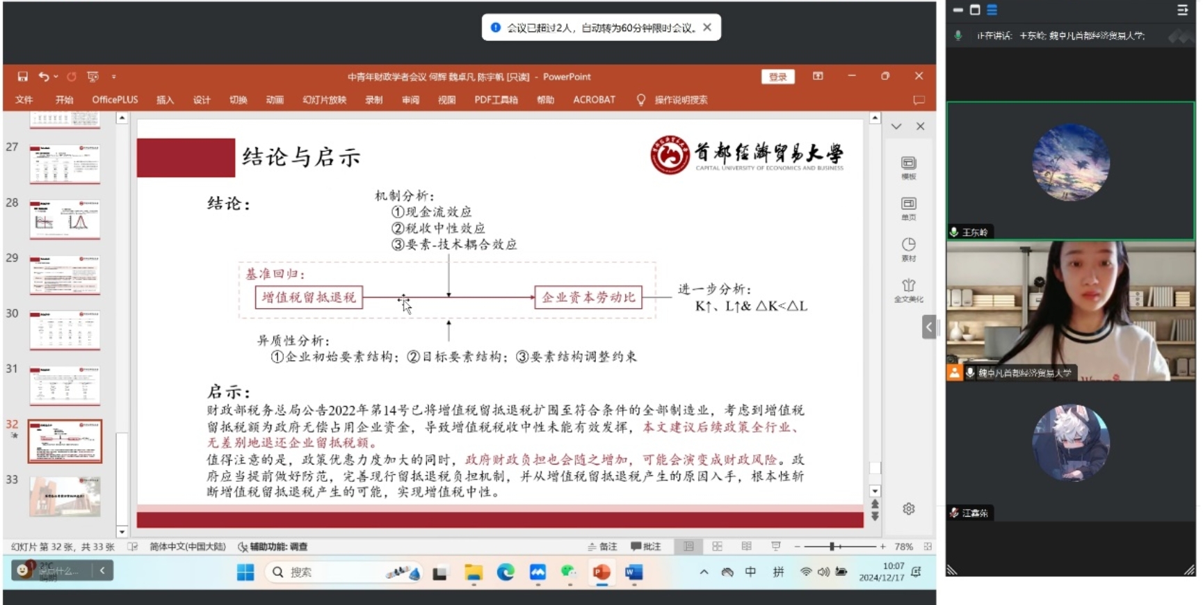 为了总结参会心得、交流学术感悟,12月17日举办了经验分享会。在分享会上,两位博士生分享了他们参与活动的经历,详细讲述了在分论坛上的报告经历,并分享与专家学者面对面交流的体会。两位博士生表示,此次会议不仅为他们提供了一个展示研究成果的平台,更是一段宝贵的学习与成长经历。在聆听与会老师和其他高校博士生的点评中,他们获得了对论文修改的新启示。该论坛为中青年财政学者搭建了一个高起点、跨学科的学术交流平台,拓宽了他们的学术视野,激发了学术思想的活跃交流。