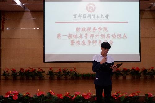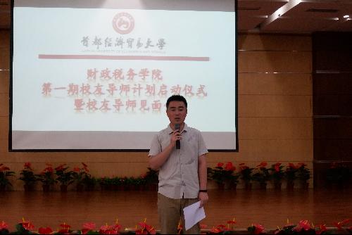 接着,财税学院党委副书记王珂老师致辞。他表示,如果要用几个词来概括我们举办校友导师计划的本意,那应当就是“解惑”与“传承”。大学生想要实现综合发展,靠的不仅仅是上什么样的课程、选什么样的老师,更要来自于前辈的指导,来自于过来人的意见与建议。这就是“解惑”,解大家职业生涯之惑,解我们工作瓶颈之惑;同时,我们的校友导师,没有一分一毫的报酬,但却愿意穿越大半个北京来与你相约,放弃与家人、与孩子相聚的幸福、温馨时光来与你相识,他们的选择,背后是一份坚守,是一份执着——聚是一团火,散是满天星,他们来自不同的专业,但有一个共同的名字——财税人,有一个共同的心系之所——财税学院。在他们手中,在他们心里,是对学院的感怀,是对同学们的祝福,是对“财税雄峰,谁与争锋,才华横溢,傲视群雄”的传承与坚守。这,就是“传承”。