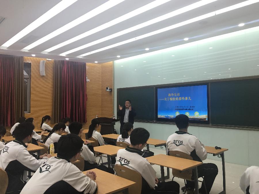 主页 » 学生工作 » 本科生 税月之高中税法小讲堂 发布日期:2016-05-10 4月19日晚6:30,搜书吧 税务系曹静韬老师为海淀区二十一世纪国际学校的高三同学组织了一场题为《海外生活――关于税收那些事儿》税收专业讲座。针对国际学校学生未来出国留学学习工作生活等现实问题,讲解了跨境税收相关问题并简要介绍了美、澳、英、法四个国家的税制,使得同学们对海外生活中的税收知识有了初步的认识。贴近学生学习生活实际的知识点以及引发学生思考的轻松互动,使得同学们受益匪浅。