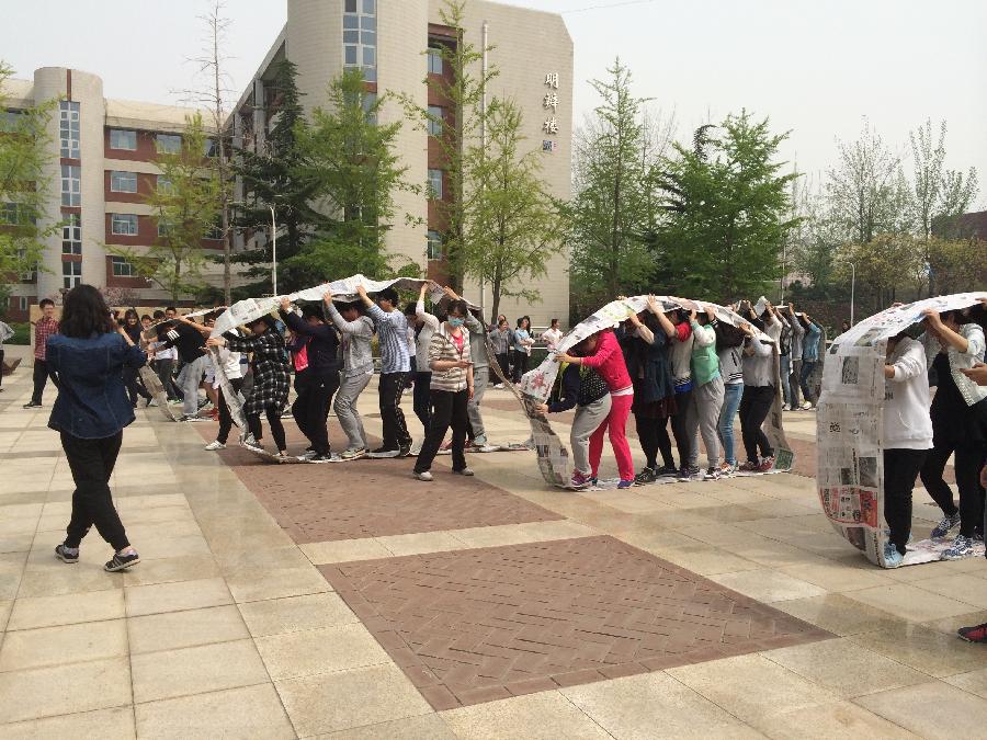 4月15日下午1:30,搜书吧 室外大赛在图书馆门前举行,比赛共分四项,20人21足,风轮滚滚,12人八字长绳及搭桥过河。比赛队伍为2013级和2014级共10个班级。