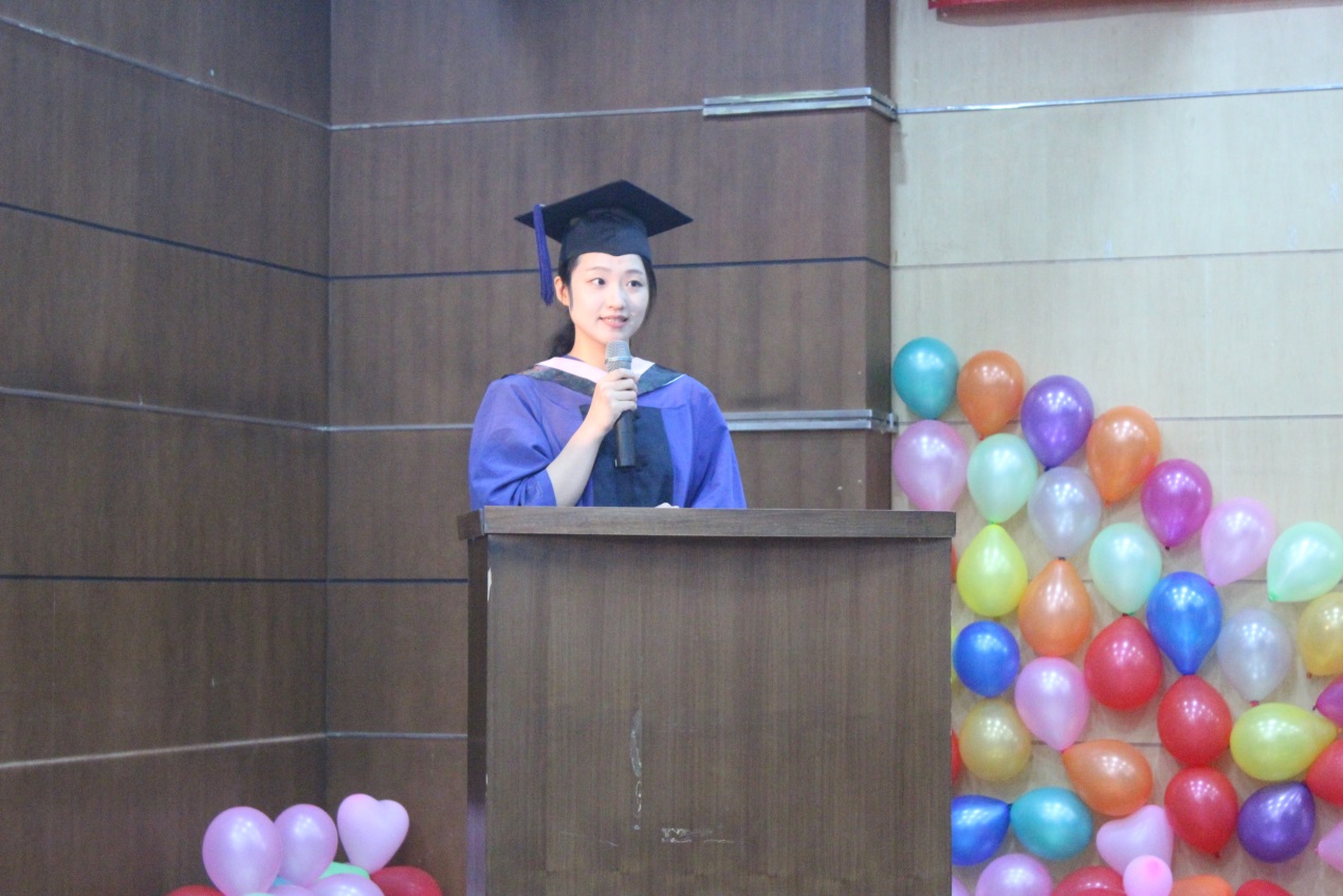 赵琼副教授代表全体教师致辞。她祝贺同学们完成研究生学业取得学位,在即将踏入社会的新起点时叮嘱同学们到新的工作岗位要踏实肯干,将在校所学运用到实际工作中,为行业发展做出自己的努力和贡献,不断学习,这个时代发展迅速,知识更新很快,要保持终身学习。这个时代不是单打独斗的时代要善于与他人合作,共同发展与进步。要锻炼身体,强健的体魄是一切发展的前提和基础。最后,祝同学们毕业快乐、生活幸福、前程似锦。