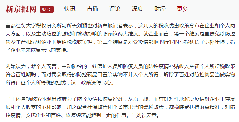 刘颖教授通过九三学社市委向政府先后提交四条建议,主要聚焦新冠病毒的宣传监督、街道社区防控物资的完善、进京人会员无缝化管理流程、细化政府疫情公布数据等方面。她还多次接受政府财政部门的政策咨询和采访,在接受《新京报》采访时她提到,就个人而言,主动防控的一线医护人员和防疫人员的防控疫情补贴收入免征个人所得税政策符合百姓期盼,对民众取得的防控药品口罩等实物不并入个人所得,这一政策深得民心。肩负着北京市人大代表的使命和责任,她积极发挥专业特长,始终站在抗击疫情最前沿。