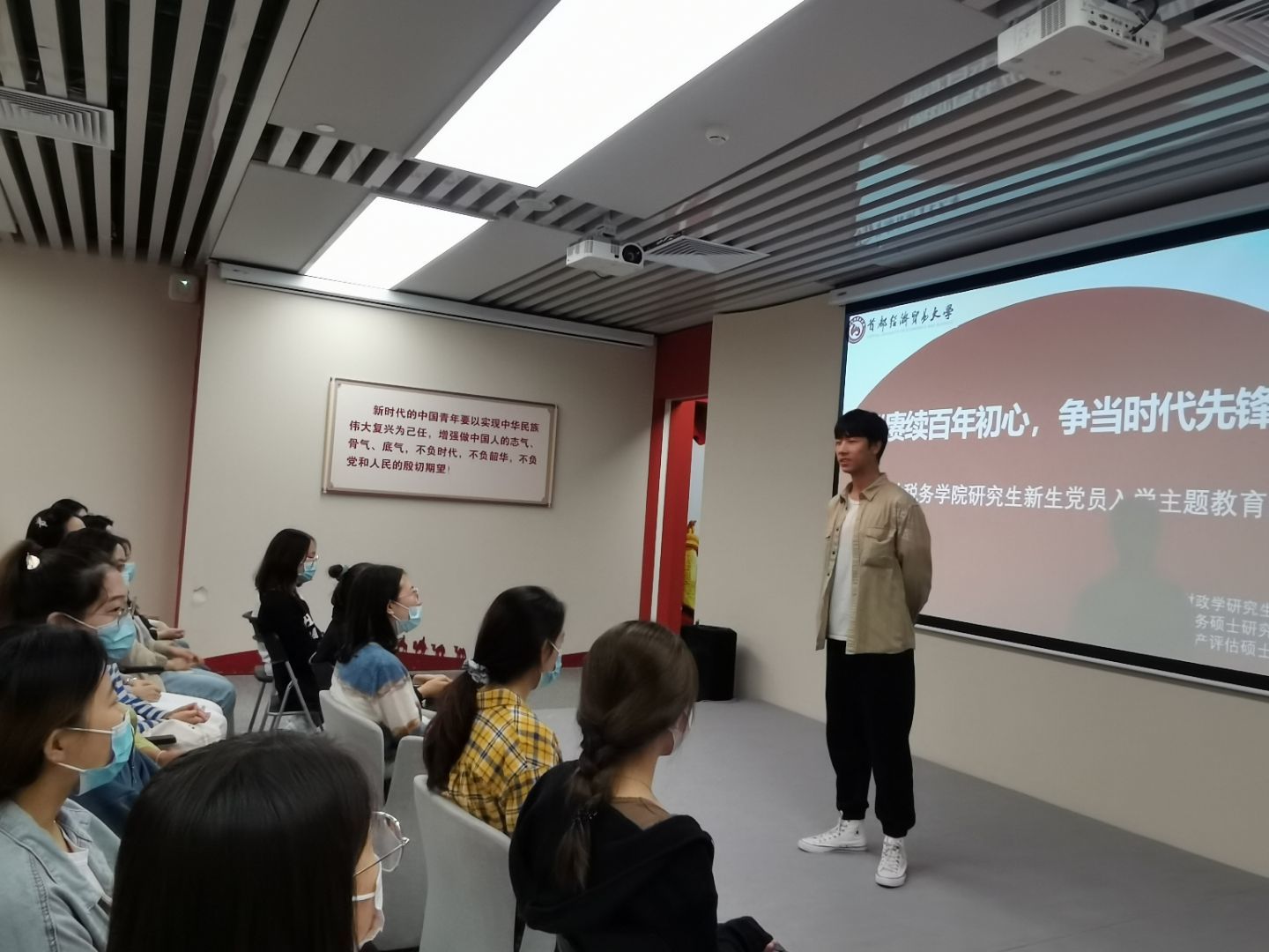 自我介绍结束后,财税学院三个党支部组织新生党员重温入党誓词,感受入党的庄严性和严肃性,坚定为共产主义事业奋斗终身的信心和决心,激励研究生新生党员进一步端正入党动机,坚定共产主义信念,提高党性修养,以更加饱满的热情投入到新学期的学习和生活中。