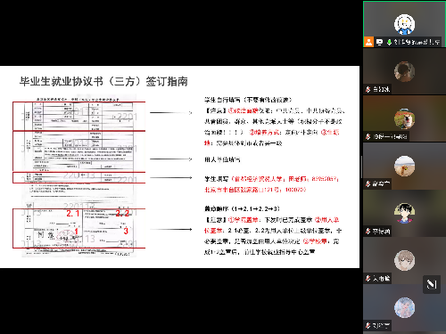 会议第一项由搜书吧 专职辅导员刘唯贤就就业的相关流程与材料进行讲解。首先刘唯贤对应届毕业生如何端正就业心态和学院往年的就业情况进行简要介绍,其次,就办理就业手续的步骤进行讲解,帮助同学们梳理整体流程及具体内容;再次,对毕业生就业协议书的签订为同学们进行了详实的指导,帮助同学领会毕业生就业协议书的价值和意义、明确具体内容应该如何准确填写以及签订就业协议书的完整流程;同时,就其他与就业相关的重要事项进行了讲解,如违约的流程与材料、就业系统的操作、档案流转的办理等;最后,基于会前对2023届本科生就业情况的调查所反映出的同学们的主要就业诉求,刘唯贤在会上给予回应,如怎样有效寻找就业平台和岗位、如何完善学院后续的就业指导和帮扶工作等问题。