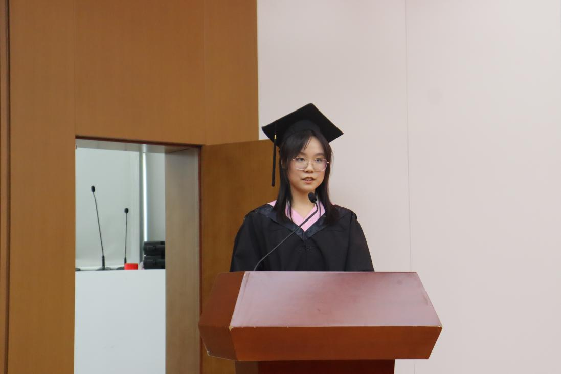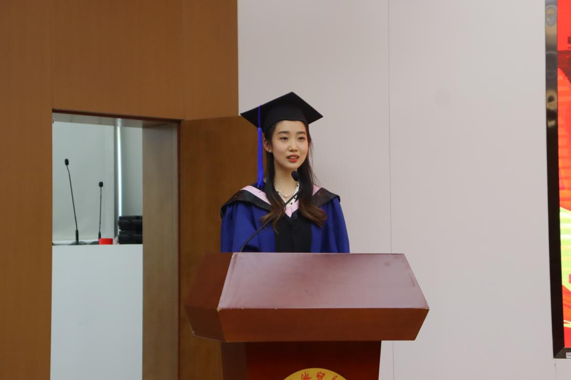 2023届本科毕业生代表张梓漪代表全体本科毕业生对学校和老师们的辛勤培育、父母与伙伴的关心帮助表示最衷心的感谢!她仍然记得第一次与室友相见的情景,仍然记得团体比赛互相加油打气的画面……她谈到,在搜书吧 的四年学习生涯锻炼了我们的意志,培养了我们的担当精神,未来一定会坚守初心的执著和胸怀家国的责任。