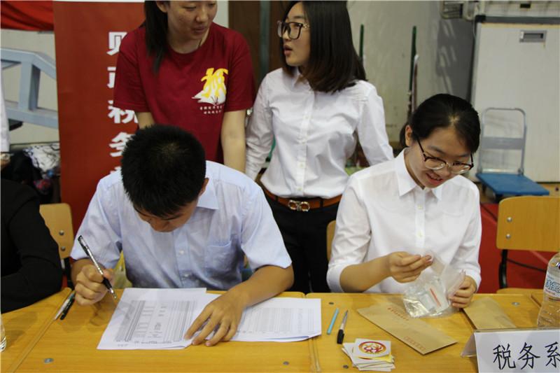 搜书吧 院长姚东旭、党委书记李红霞、副院长何晴、党委副书记王珂和相关行政老师及学院学生会、分团委的各部门部长、干事齐聚体育馆迎接新生。学生会、分团委的干事身着院服组成强大的志愿服务团,在新生出口高举“财税接待”的牌子,时刻准备带领新生办理报到、入住等手续。新生报到紧张有序地进行。
