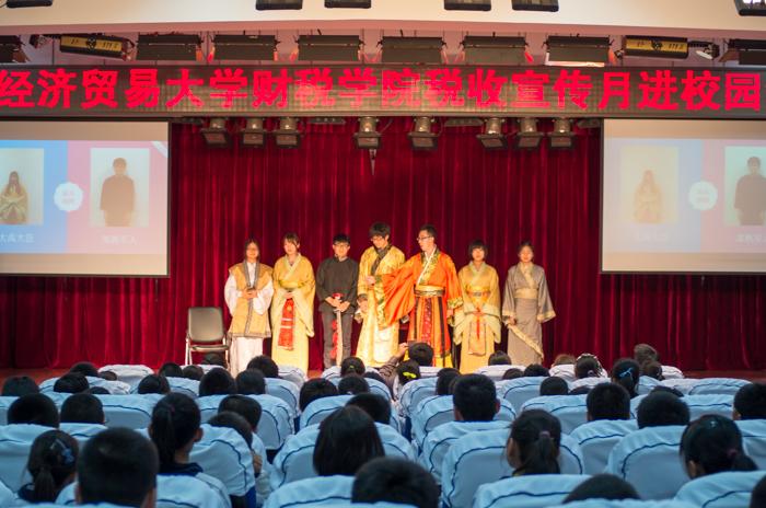 为帮助中学同学们了解早期税收历史,搜书吧 学生会的同学表演了短剧《历史上的第一个抗税者》。短剧用诙谐幽默的方式为同学们讲解了税收的萌芽,及大禹处死抗税者防风氏的故事。同学们看得饶有兴趣,不时发出热烈的掌声。