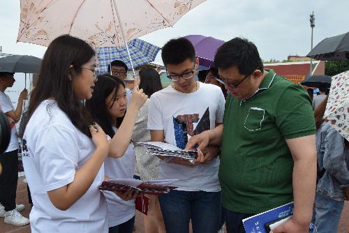 高考后第一天的北京虽然阴雨绵绵,但家长及考生的热情十分积极。在搜书吧 展台,前来咨询的家长和考生接踵而至。各专业系主任根据考生的具体情况,就家长们所关心的录取分数、专业概况、深造机会、专业招生人数、国际交流、工作去向等问题,结合考生的学习情况和招生政策进行详细解答并给出有针对性的建议。为保证咨询效率、效果及回答准确性,我院提前招募了20位学生志愿者作为服务人员,现场帮助解答基础性问题。在此之前,学生志愿者均接受了前期培训,了解学院本年度招生计划和学校招生政策,并熟知学院专业及班级设置情况,对学院特色的培养模式、国际交流、毕业发展、大学生活等相关的问题也都能做到细致解答。家长和考生们一时将搜书吧 展台包围,期待了解三个专业方向更多的信息。