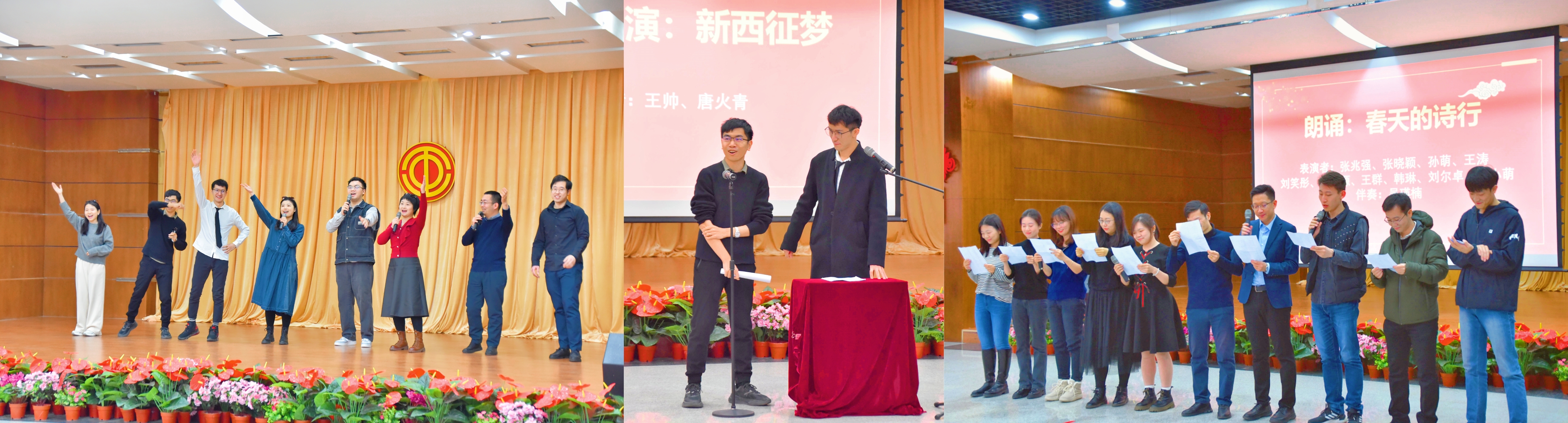 在青年教师才艺展示板块,吴瑛楠、刘唯贤、曹越、武威、韩瑞雪、张哲元等八位老师舞动献唱《奢香夫人》,歌声动听,舞蹈优美,震撼全场;王帅、唐火青两位老师的相声表演《新西征梦》诙谐幽默,为现场教职工带来诸多欢乐;孙萌、张晓颖、王涛、张兆强、程小萌、刘笑彤、薛钦源、韩琳、王群、刘尔卓等十位老师的诗歌朗诵《春天的诗行》情感充沛,伴随吴瑛楠老师的优雅钢琴旋律,令人充满对春天的憧憬。正如诗歌中所言:“我们重温过去,我们憧憬未来。我们拥抱阳光,我们放飞梦想!”