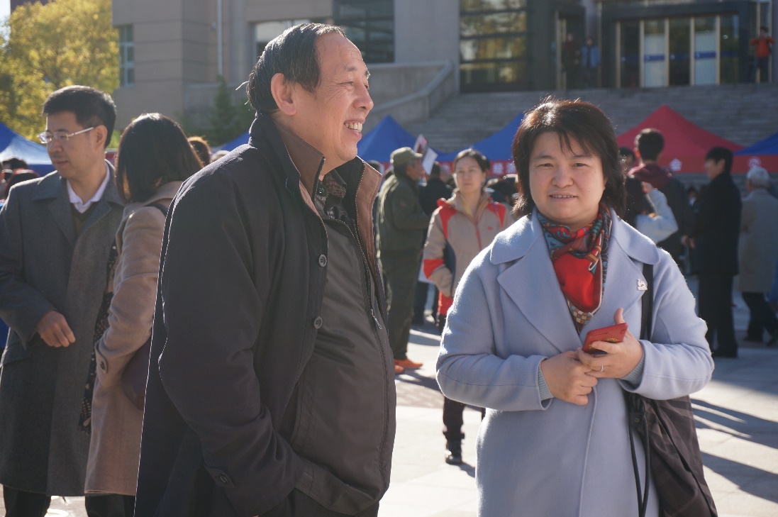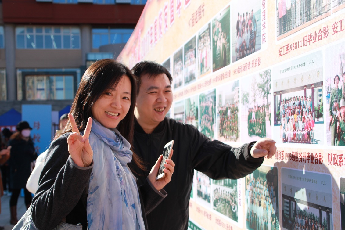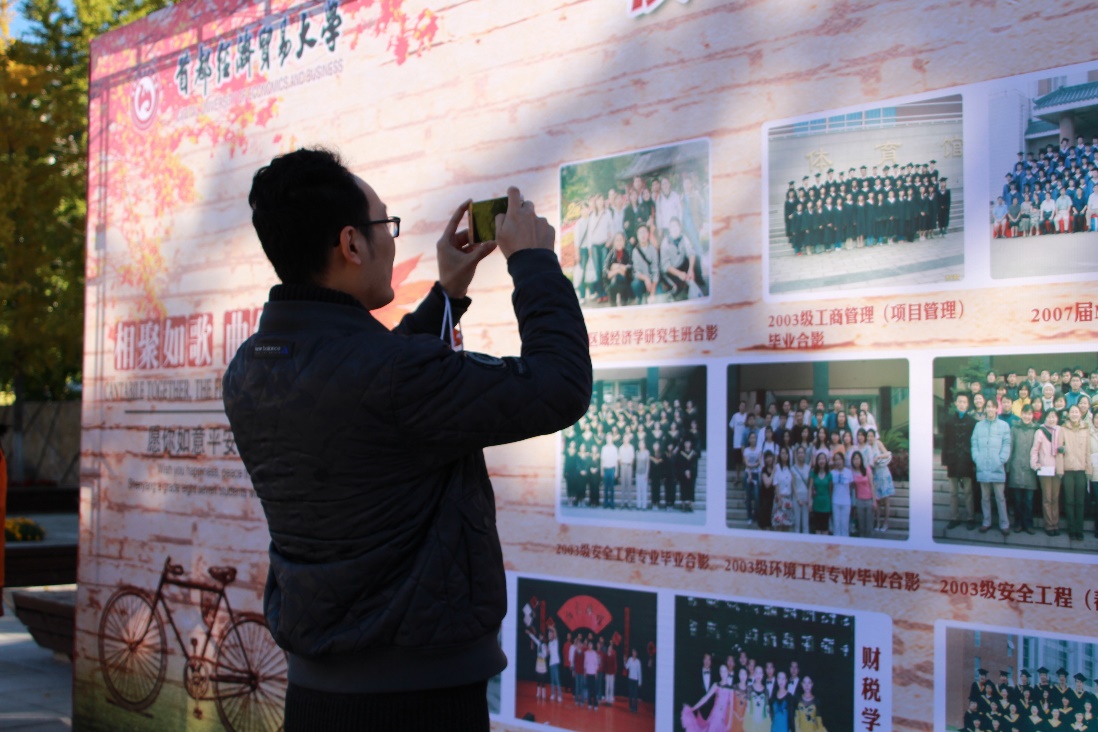 值年返校活动当天,校友们到签到台签到领取了首经贸校友会及财税学院提供的宣传册和纪念品后,便在值年返校的主会场稍事休息,等待大会正式开始。校友们或在广场上与老师们谈心、合影,或一起在老照片墙上找寻自己当年的英姿。有的校友带着爱人、孩子一起回校看望老班主任,聊到自己上学时的趣事,与老师和同学们激动地拥抱,仿佛时光停滞,还是当年青春韶华的模样。